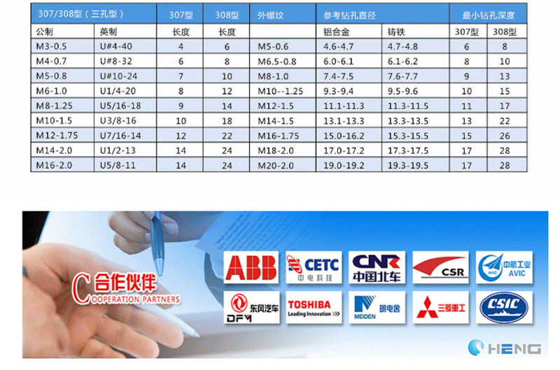 使用标有规定螺纹规格的钢丝螺套专用丝锥攻丝,攻丝的长度必须超过钢丝螺套长度,对于通孔,要全部攻丝;攻丝的精度决定终标准内螺孔的公差带,使用者要适当地选择攻丝方法和润滑,盲孔攻丝要适当用力, 以防折断丝锥。攻丝后,螺纹孔应清理,一般用压缩空气喷枪吹,盲孔时还应使用带径向孔的长喷枪自下而上清理, 也可以用清洗的方法清理螺纹孔。螺纹孔精度高时,应用专用钢丝螺套底孔塞规进行检查。